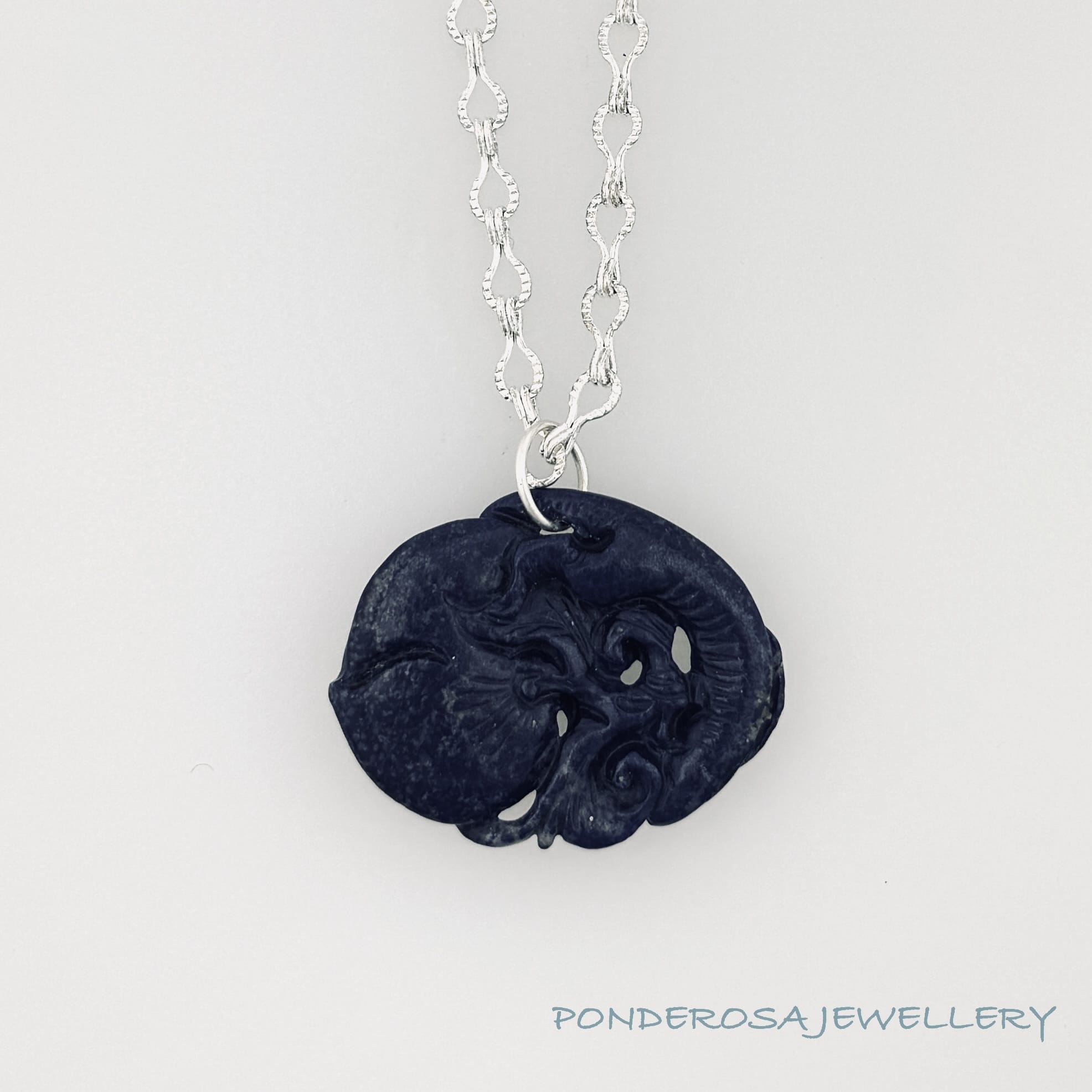 This beautiful antique Chinese hand carved lapis stone is paired beautifully with a plated silver chain This is a special piece of jewellery to add to any collection.