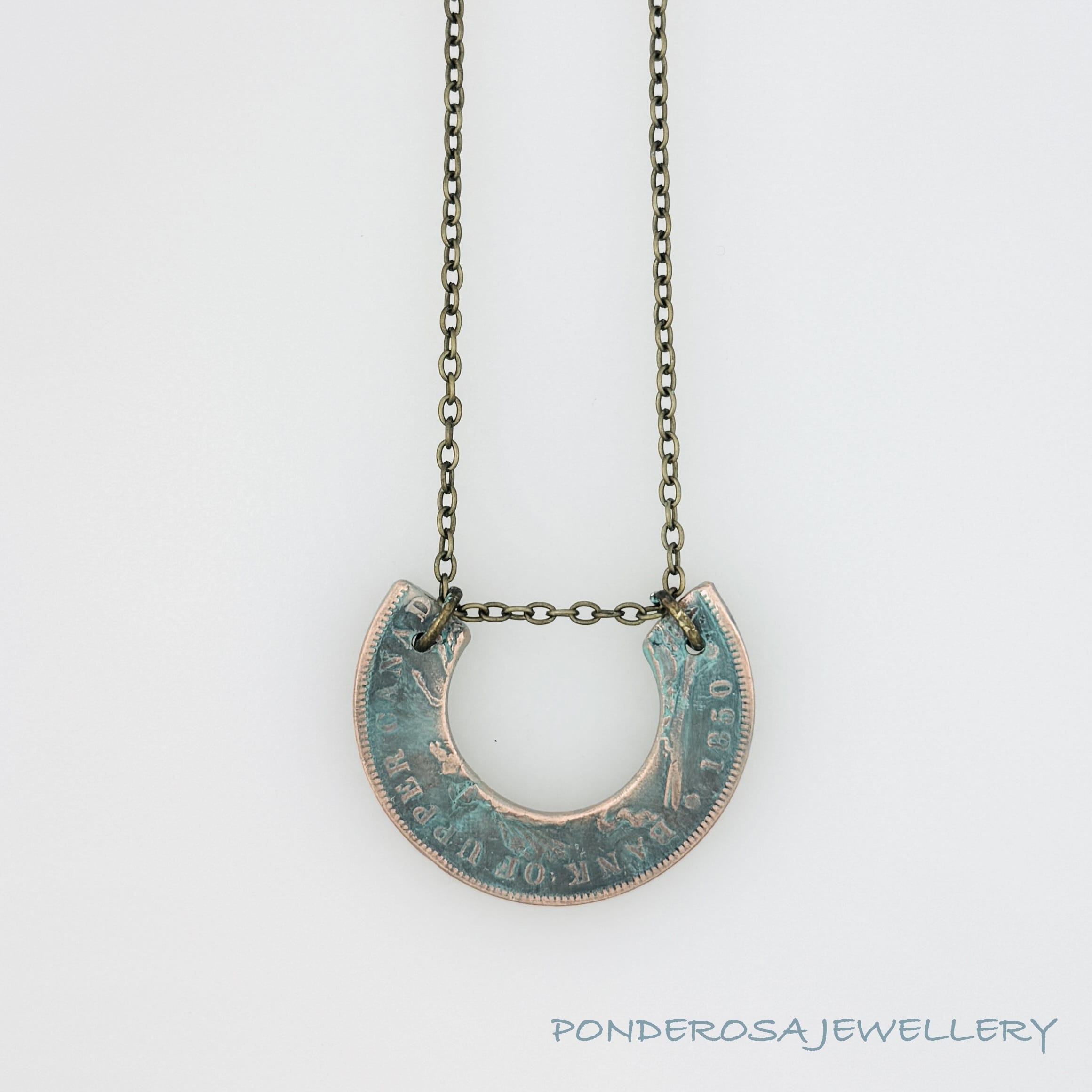 This bronze pendant is a 1850, Bank of Upper Canada Token, (One Penny) it has a beautiful blue patina has been designed with a brass chain. One-of-a-kind and elegant, this is a special piece of jewellery to add to any collection.