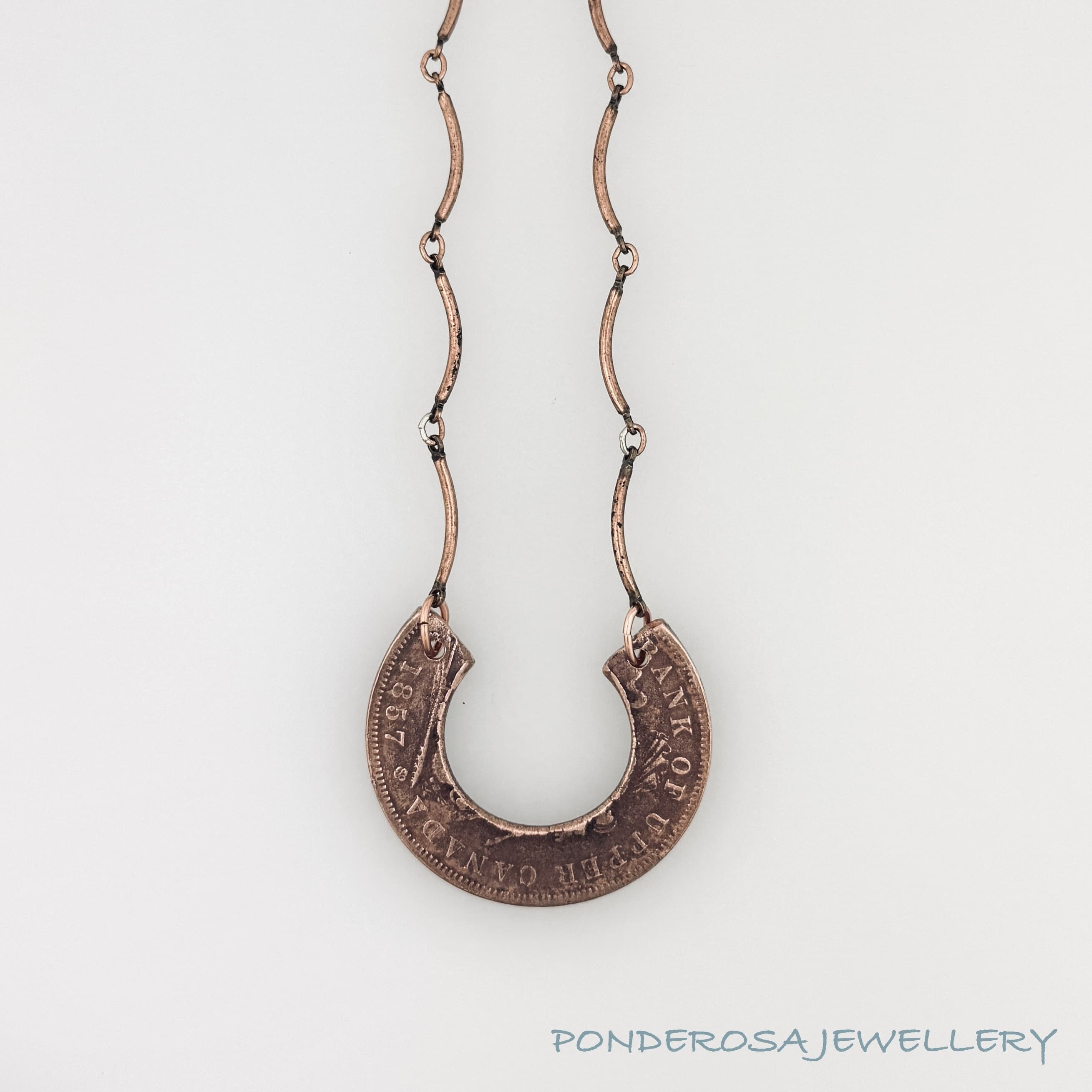 This bronze pendant is a 1857, Bank of Upper Canada Token, (One Penny) designed with a pure copper chain. One-of-a-kind and elegant, this is a special piece of jewellery to add to any collection.