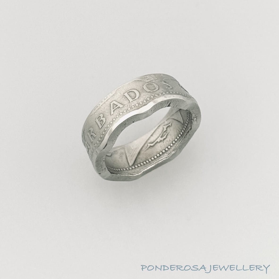 This 1979, one dollar coin, from Barbados, has been turned into a size 8 1/4 ring. The copper content is 75%. Enjoy wearing this piece of history.