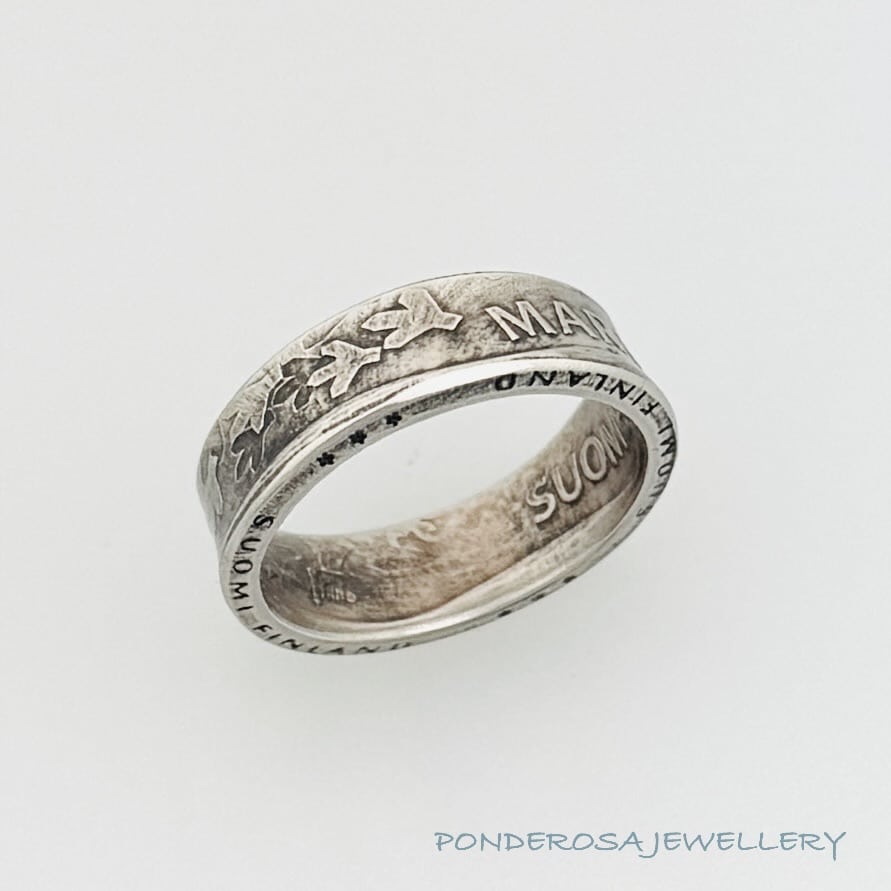 This 1 Markka coin from the Finland has been turned into a size 7 1/2 ring and has a copper content of 75 %.  Enjoy wearing this very unusual piece of History.