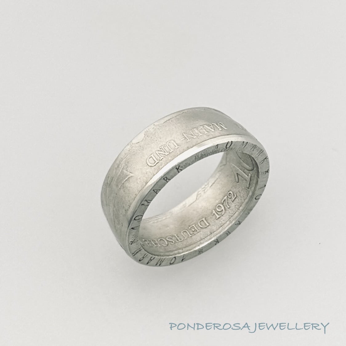 This 1972 coin from Germany has been turned into a size 10 ring and has a copper content of 63 %. Enjoy wearing this very unusual piece of History.