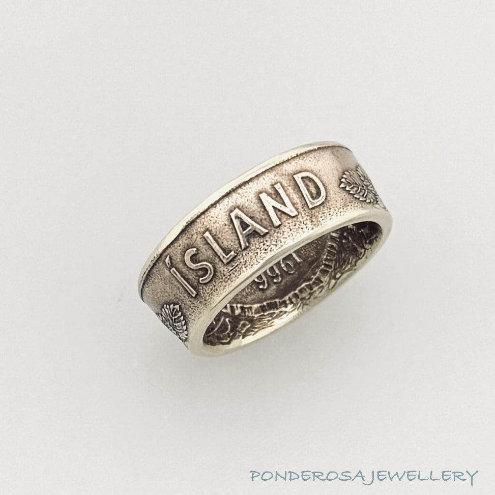 This 2 Kronur coin from the Iceland has been turned into a size 8 ring and has a copper content of 73 %. Enjoy wearing this very unusual piece of History.