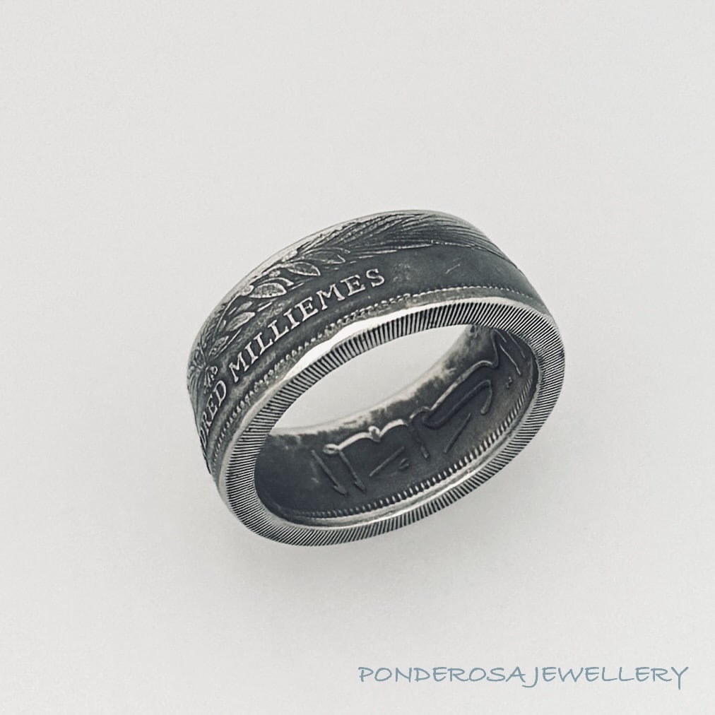 This 100 Milliemes coin from Libya has been turned into a size 9 ring and has a copper content of 75 %. Enjoy wearing this very unusual piece of History.