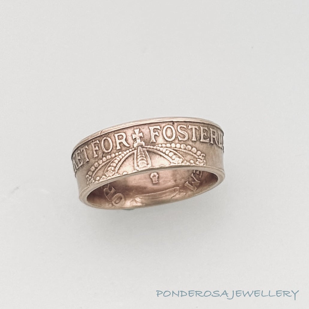 This 1950 coin from Sweden has been turned into a size 8 ring and has a copper content of 95 %. Enjoy wearing this very unusual piece of History.