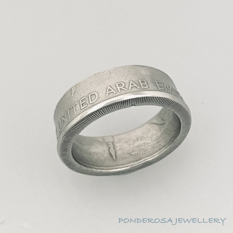 This 1 Dirham coin from the United Arab Emirates has been turned into a size 9 ring and has a copper content of 75 %.  Enjoy wearing this very unusual piece of History.