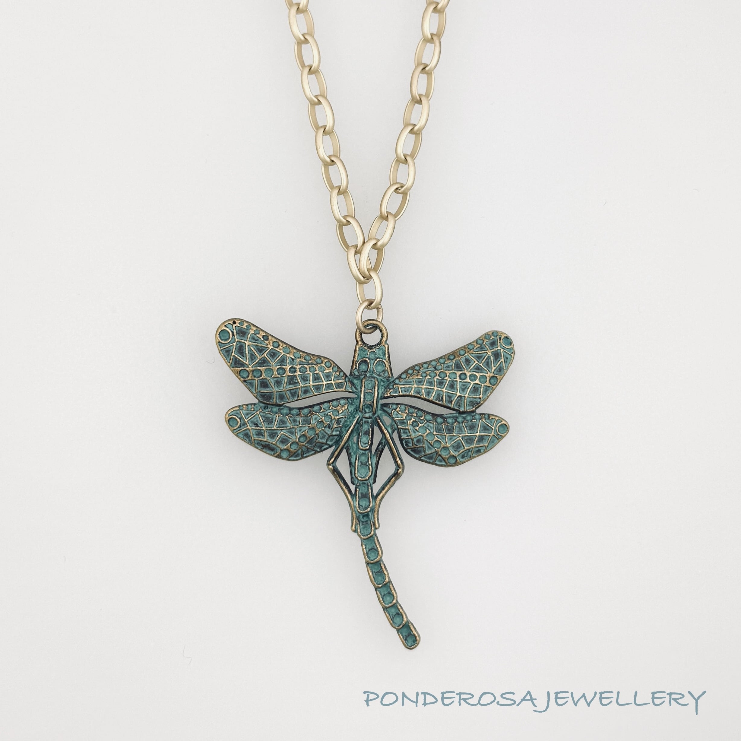 This vibrant oxidized brass dragonfly pendant with a beautiful blue patina has been designed with a matte gold pewter chain.