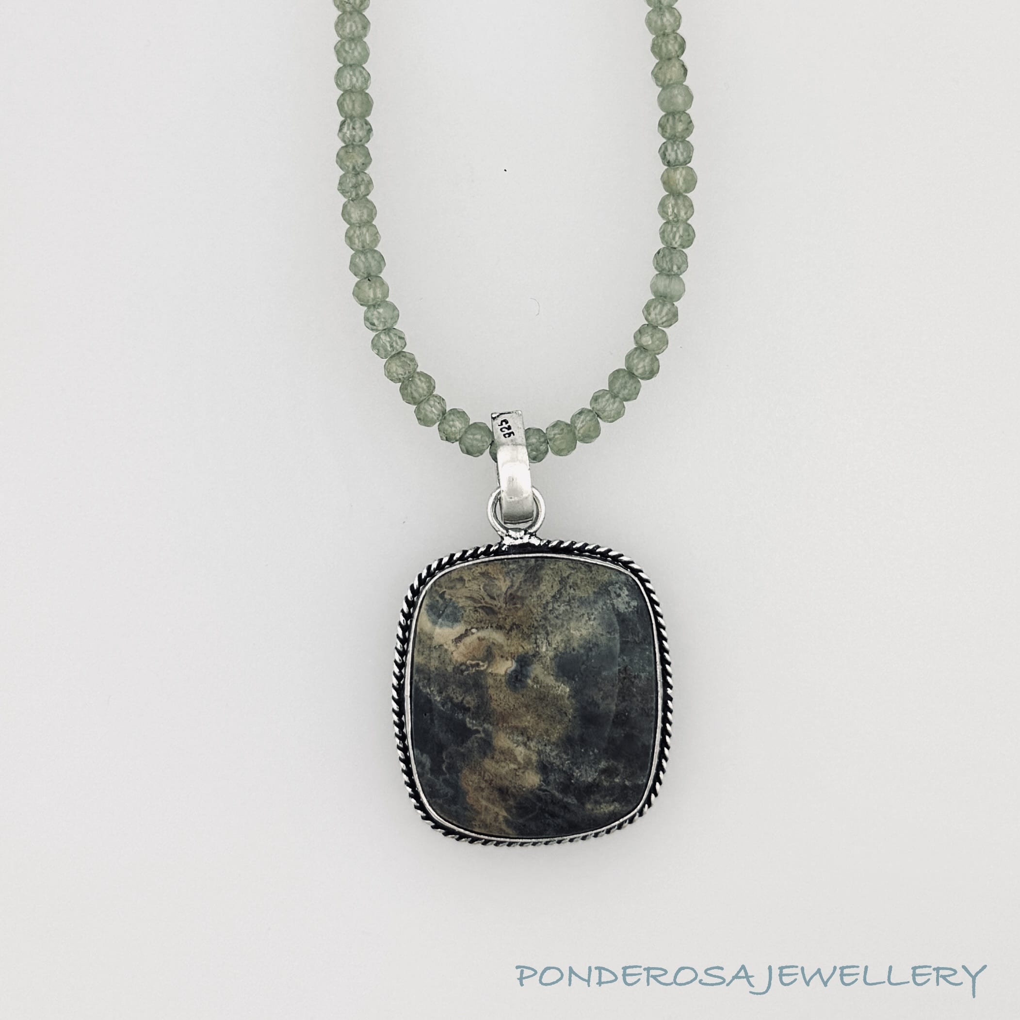 This jasper stone pendant has been set in silver and paired with faceted stone beads.
