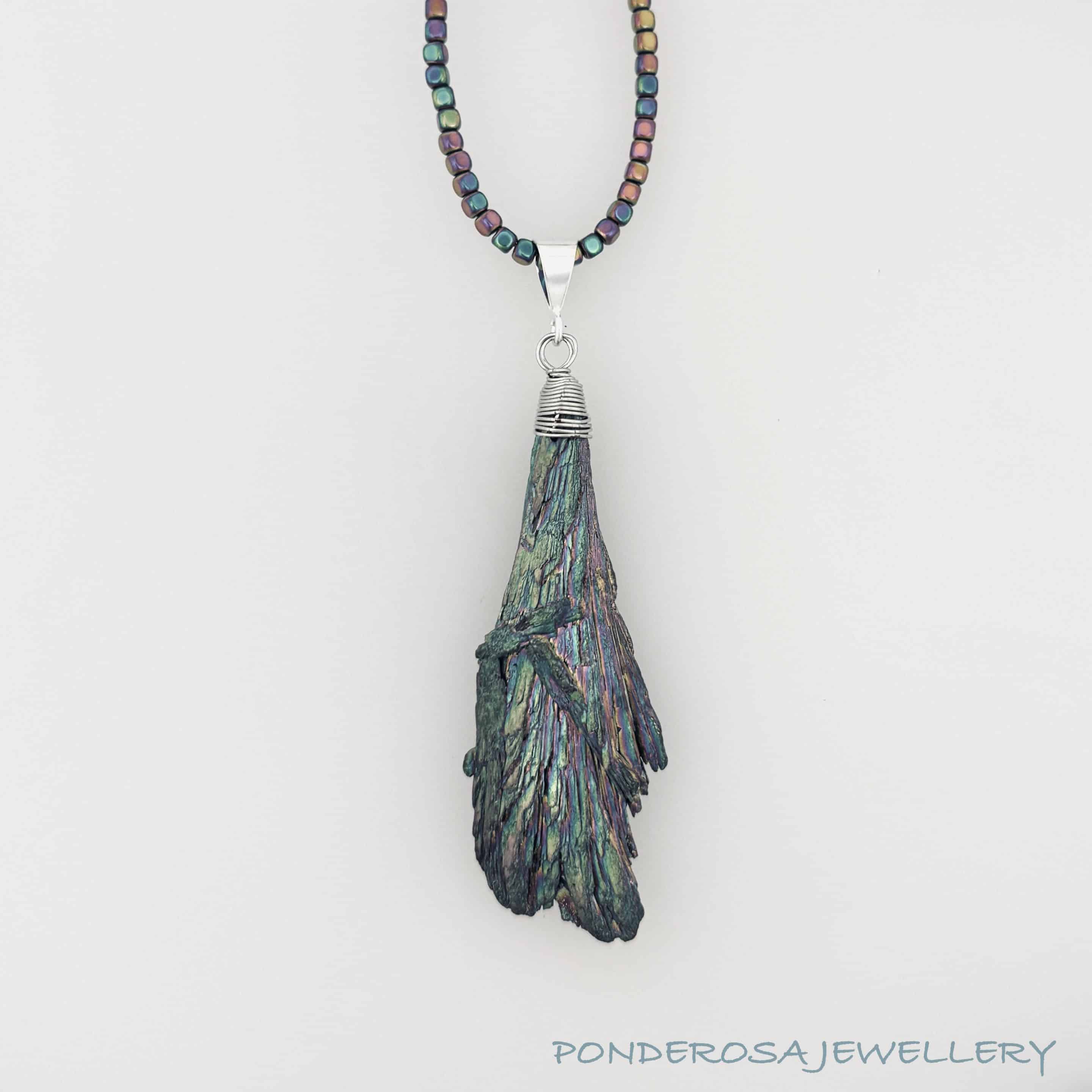This very unusual Titanium fumed Kyanite stone has been paired perfectly with faceted glass beads