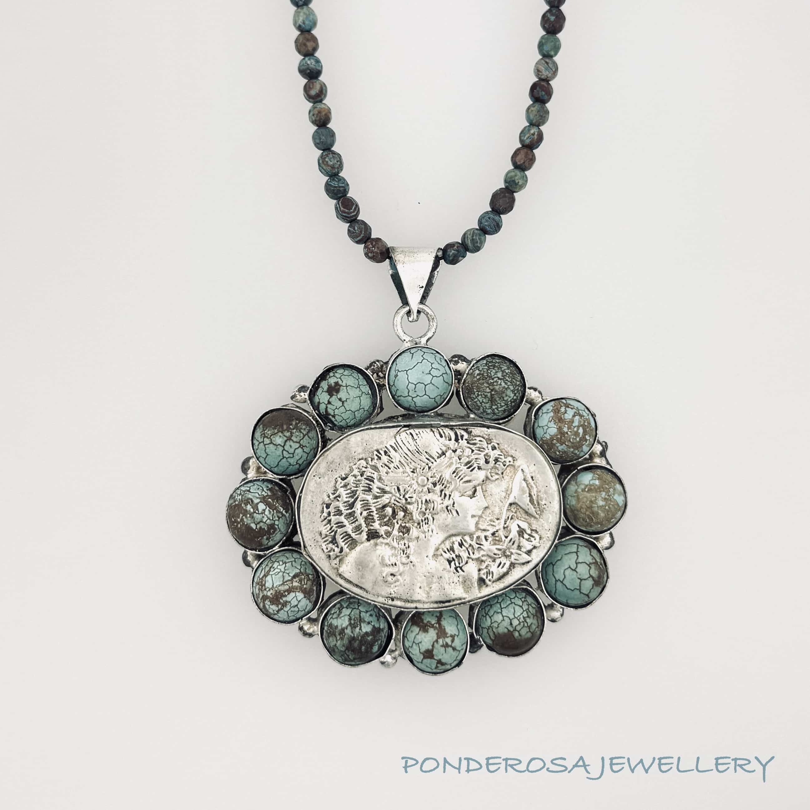 This very cool metal “Lady” has been designed with turquoise and faceted stones which compliment the pendants natural finish.