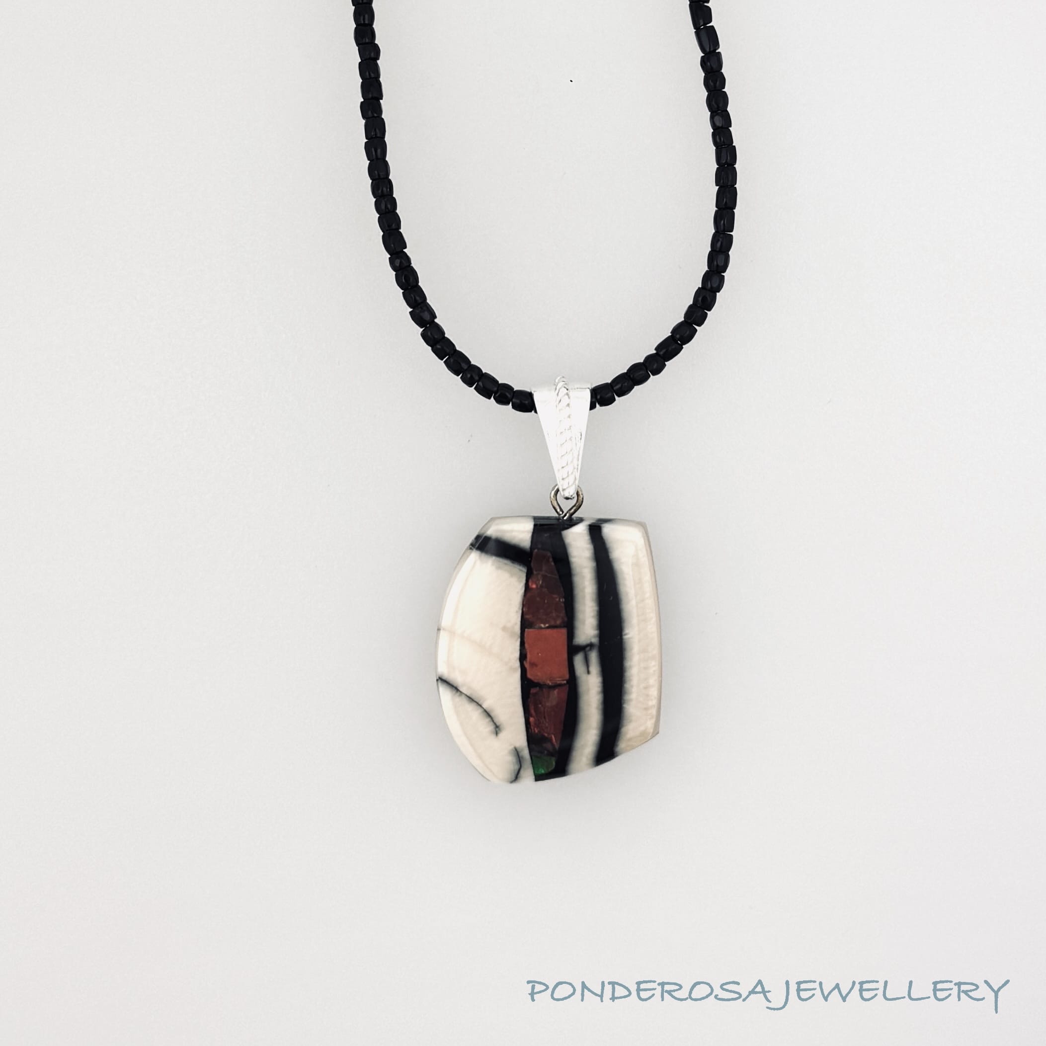 This Mammoth Ivory from the Yukon and Ammonite stone, from Alberta has been designed with faceted black glass seed beads. The pendant is handmade and one of a kind from Vancouver, British Columbia. Truly a very special Canadian treasure.