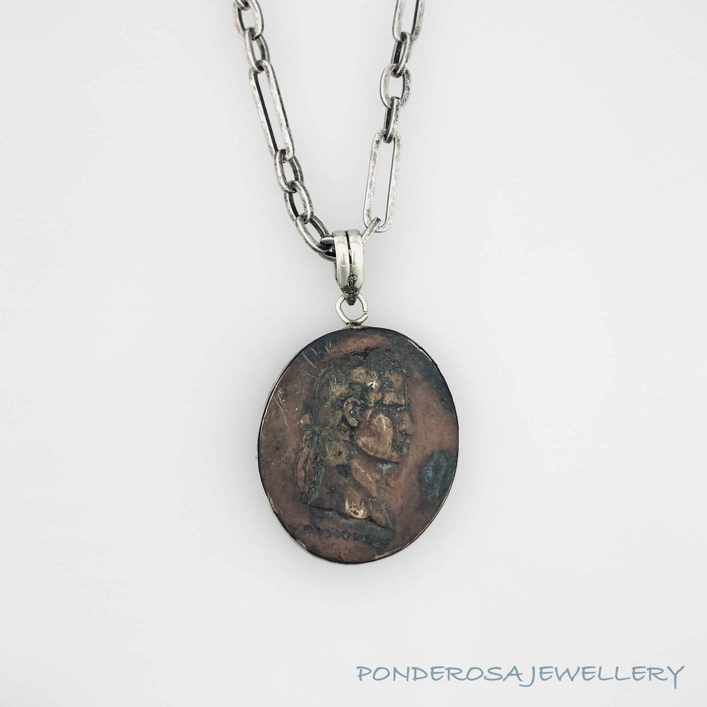 This very cool Medallion, found in a European market, has been paired with a silver plated chain. Truly a “one of a kind” piece of wearable art.