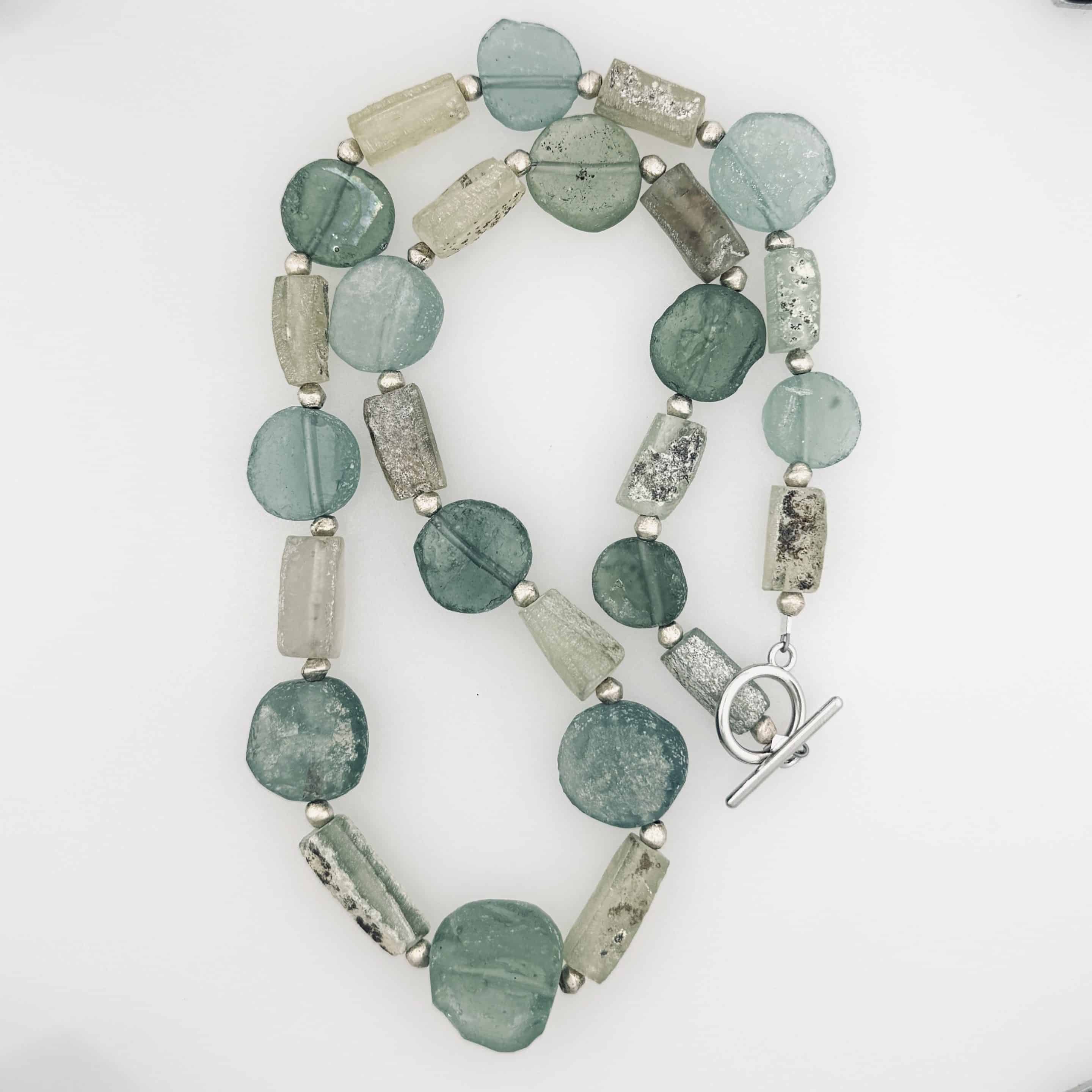 This very unusual necklace has been designed with pieces of natural 2000-year-old Roman glass and small metal beads. The ancient glass was found in the Middle East near the site of a ancient Roman glass factory.