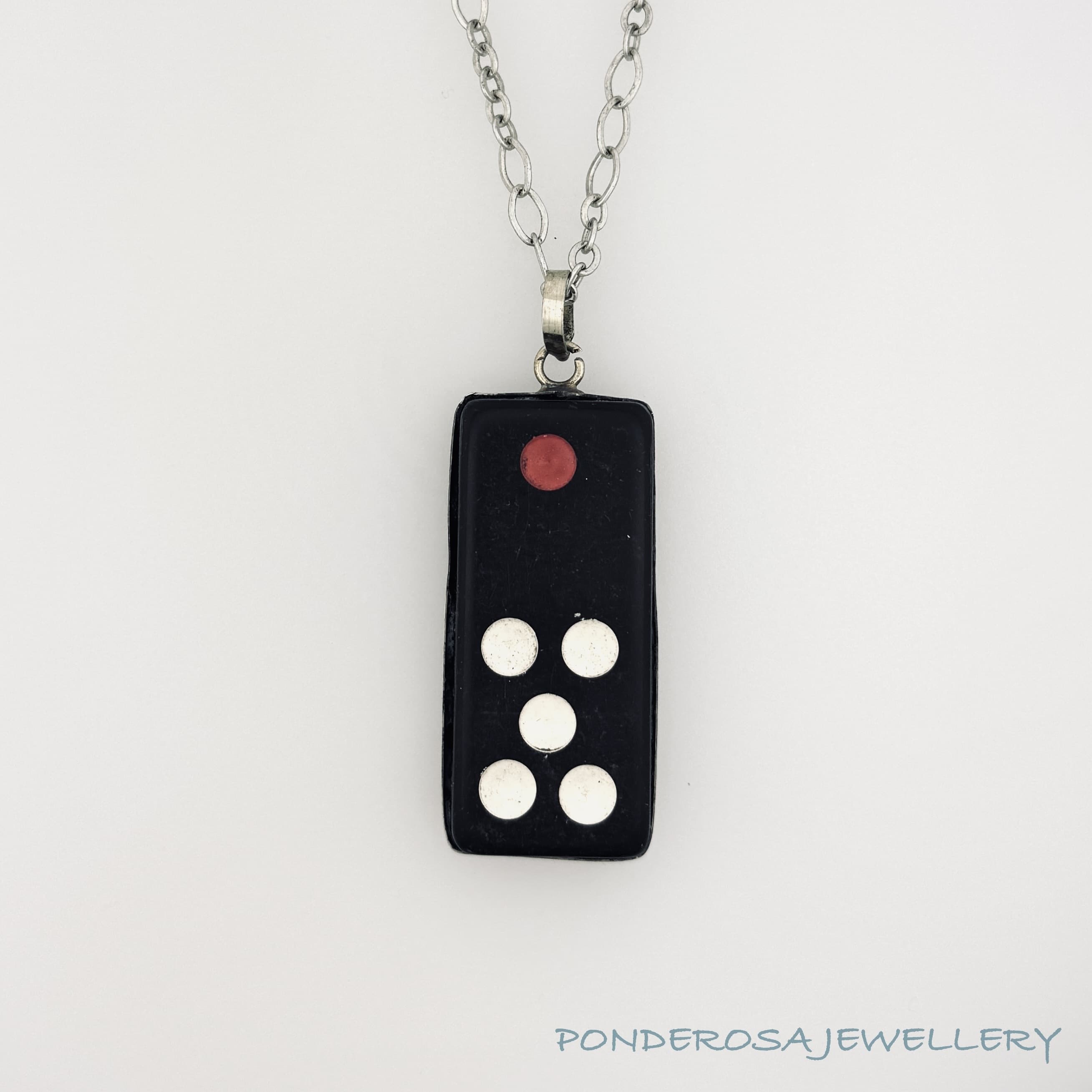This rare vintage “Domino” is from the early 1900′ The pendant 2 ” long x 1 ” wide and the pewter chain is 19″ long.