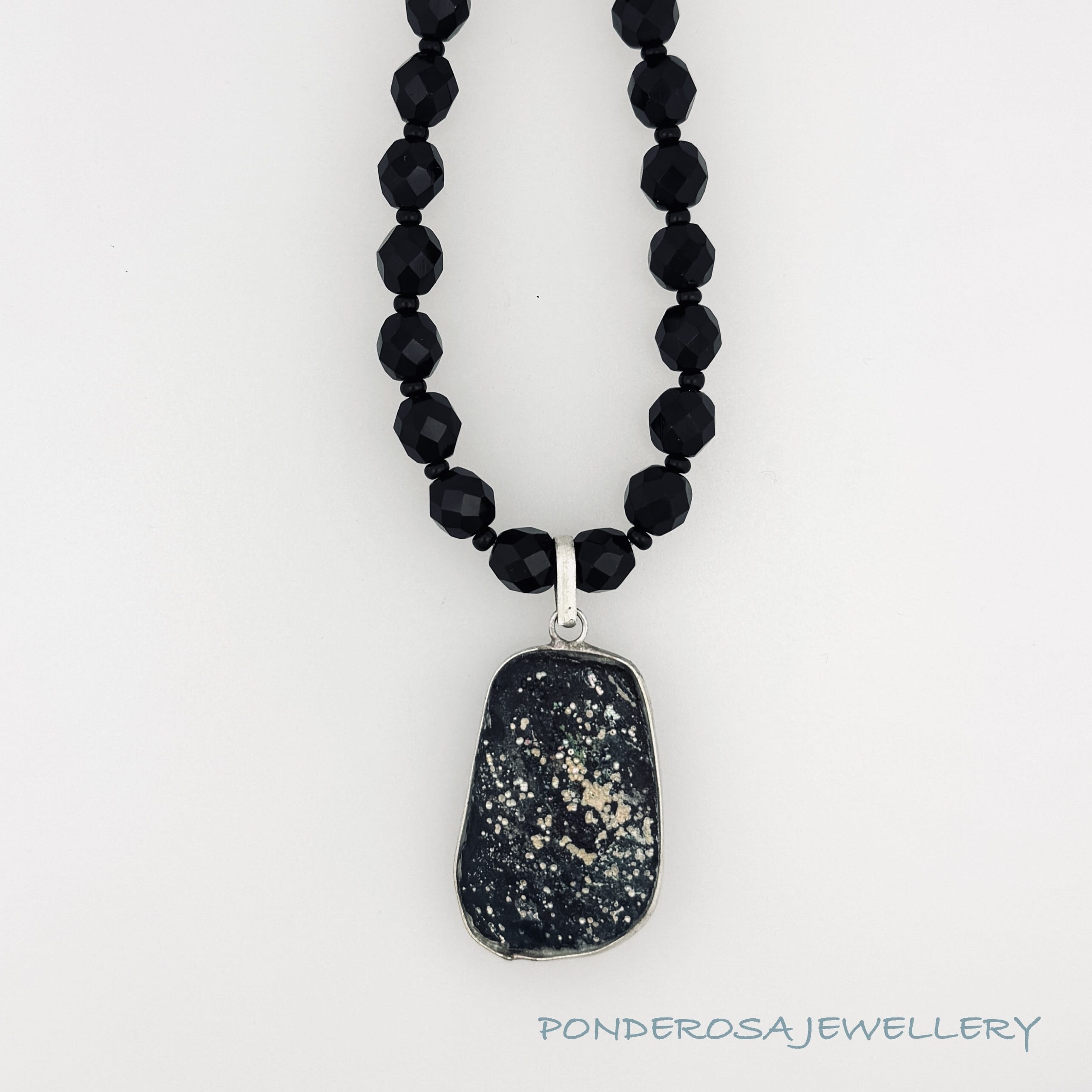 This dark blue piece of 2000 year old Roman Glass, from the Middle East has fabulous Patina and is designed with black faceted Vintage Glass Beads. This is a special piece of jewellery to add to any collection.