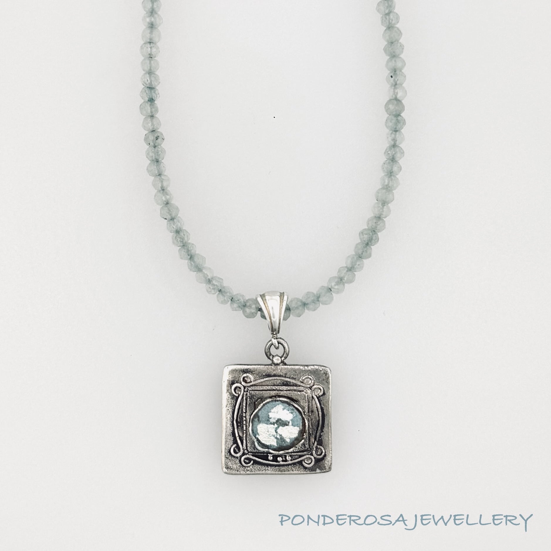 This pendant is a piece of 2000 year old gorgeous Ancient Roman Glass with exceptional patina. This pendant is set in sterling silver and designed with faceted stone beads. One-of-a-kind and elegant, this is a special piece of jewellery to add to any collection.