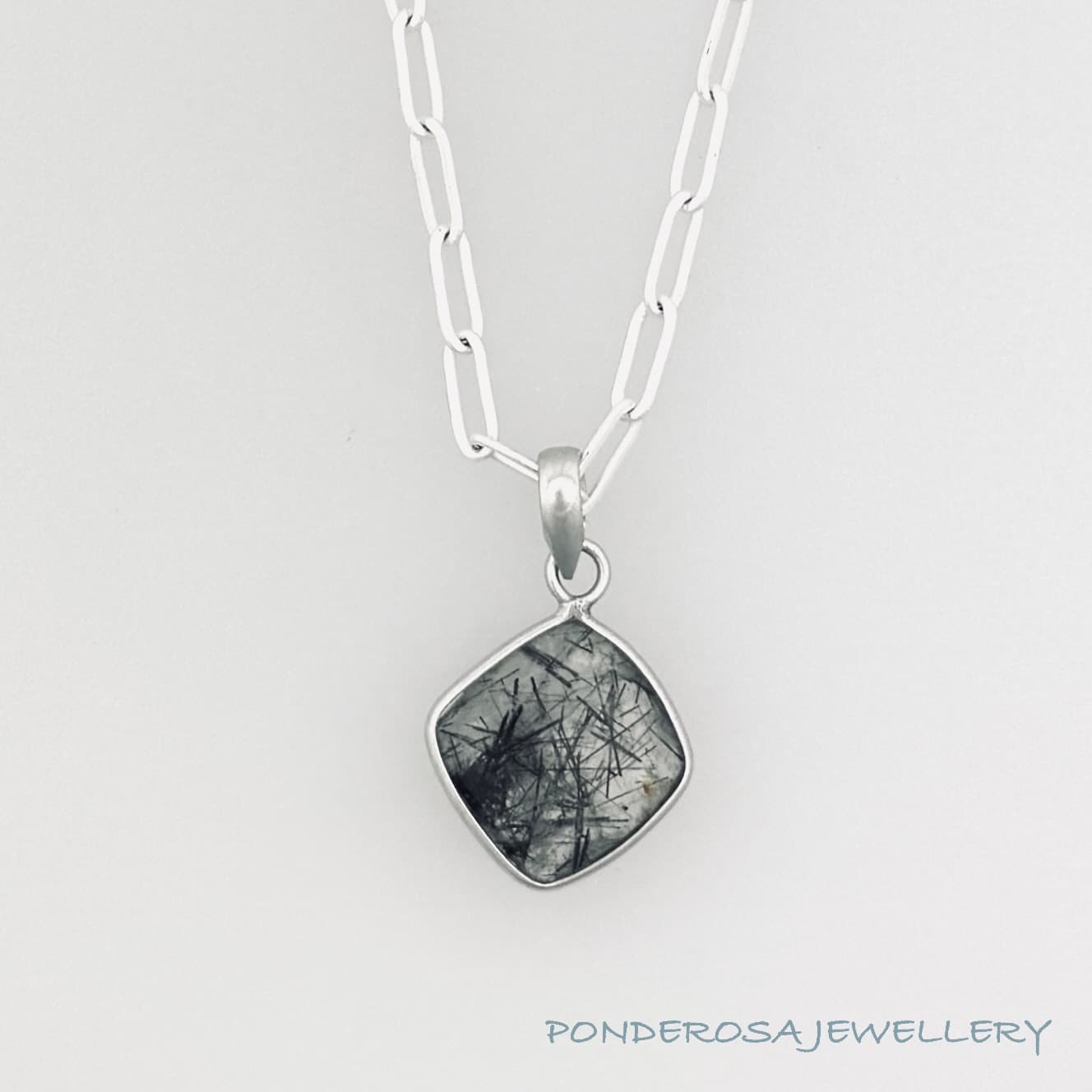 This black rutilated quartz stone pendant has been set in silver and designed with a matte silver plated chain.