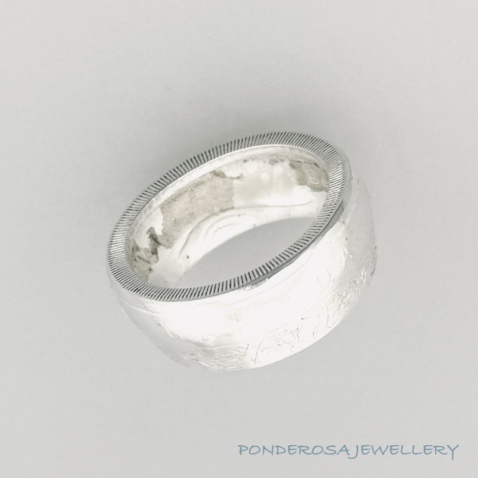 This 2014 Silver Coin from Canada has been turned into a size 9 1/2 ring and has a silver content of 99 %. (1/2 ounce). This Royal Canadian Mint Coin is from the “O Canada” – Down the Old Maple Tree, Collection.
