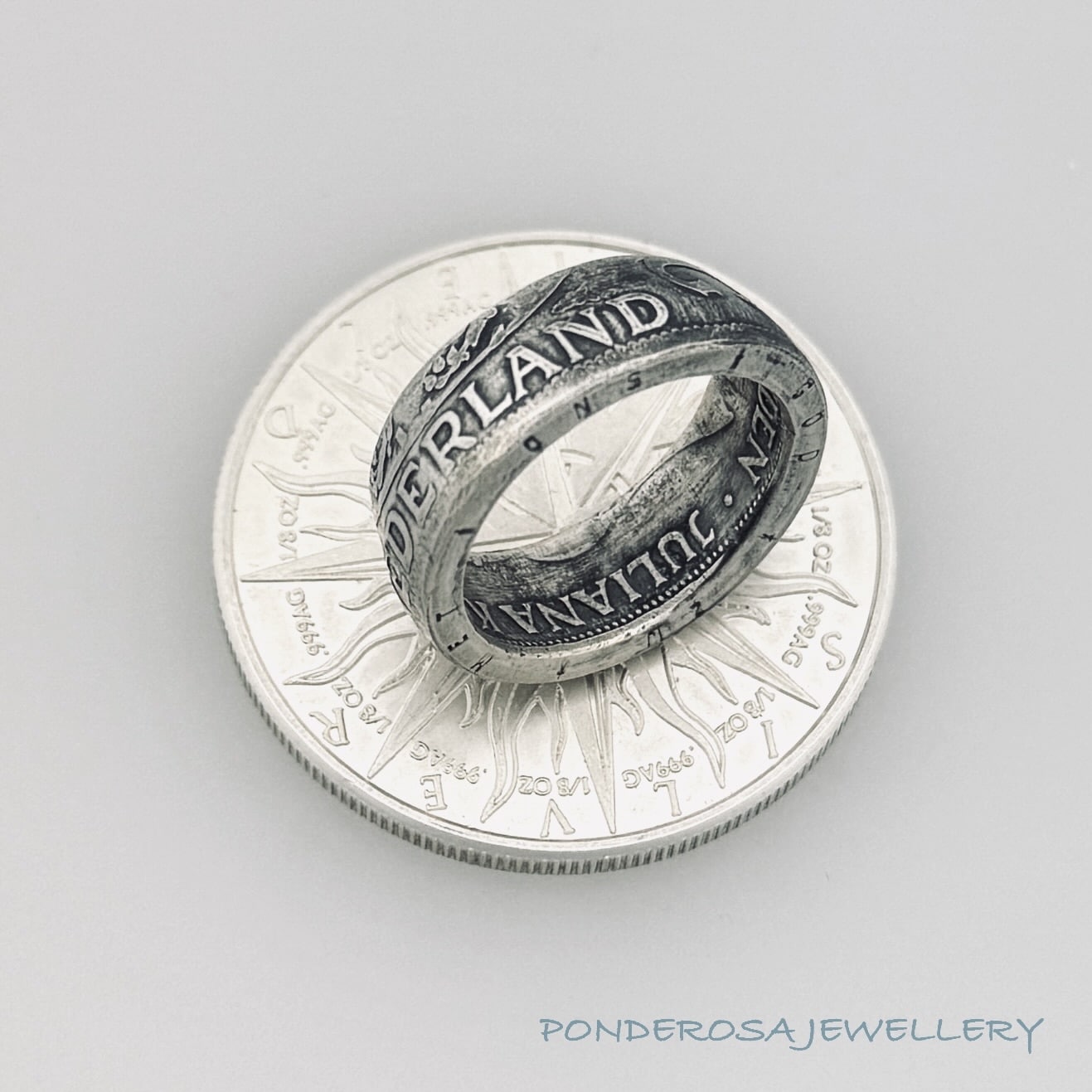 This coin from Netherlands has been turned into a size 10 ring and has a silver content of 72 %. Enjoy wearing this very unusual piece of History.