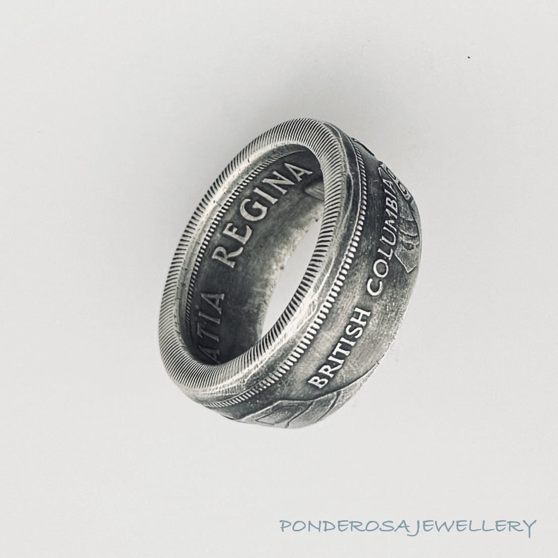 This 1958 Silver Dollar has been turned into a size 11 ring. This coin ring has a silver content of 80 %. Enjoy wearing this very unusual piece of History.