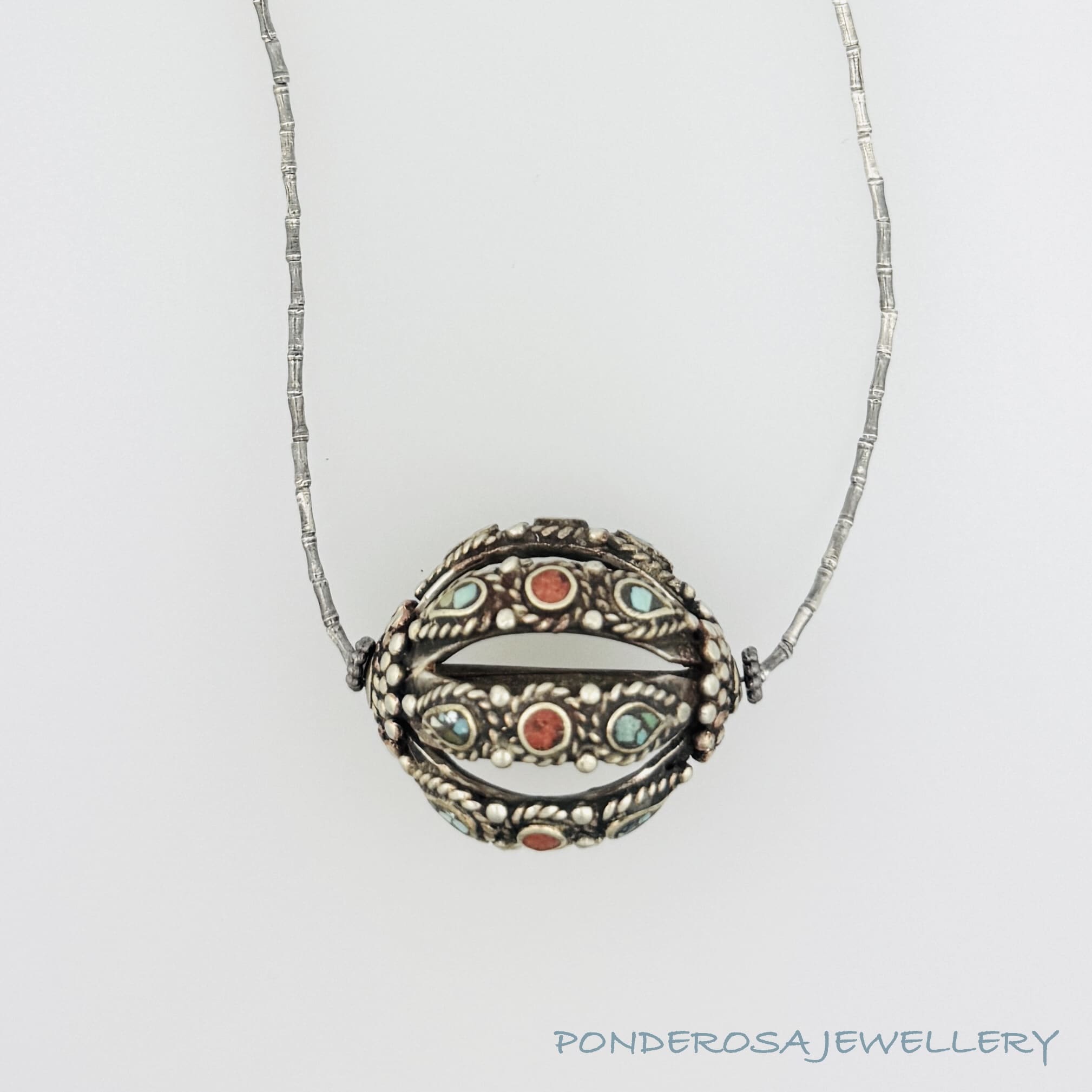 This whimsical sterling silver pendant with inlaid turquoise and carnelian stones has been designed with a sterling silver beads.